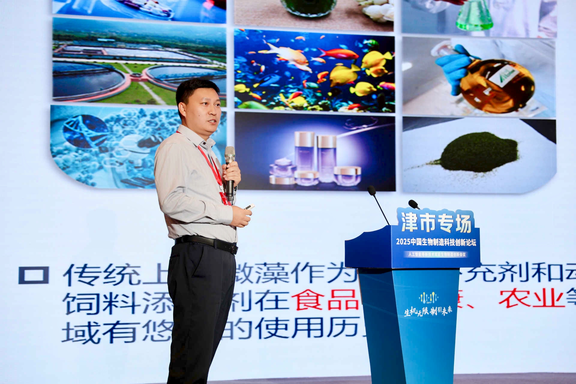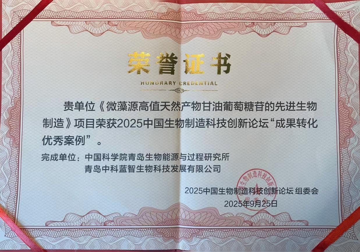 为促进生物制造技术创新成果转化落地,论坛前期组织征集评议并在会议期间正式发布“2025生物制造颠覆性创新成果和成果转化优秀案例”榜单。中国科学院青岛生物能源与过程研究所(以下简称“青岛能源所”)与青岛中科蓝智生物科技发展有限公司(以下简称“中科蓝智”)的合作成果“微藻源高值天然产物甘油葡糖苷的先进生物制造”成功入选并获评“成果转化优秀案例”。本次大会共评选出7项成果转化优秀案例,“微藻源高值天然产物甘油葡糖苷的先进生物制造”为微藻领域唯一入选项目,彰显该成果在技术创新性、产业成熟度与社会效益方面的广泛认可度。