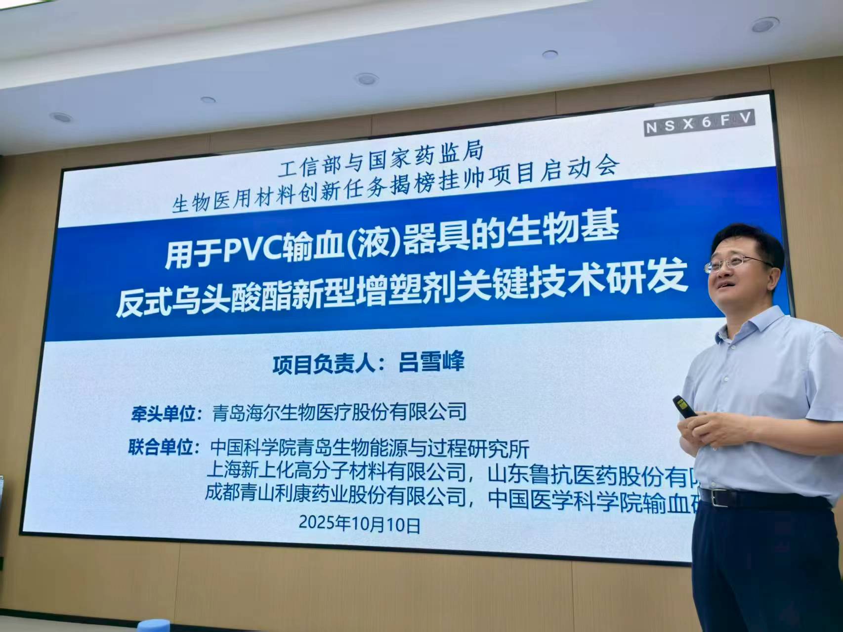 2025年10月10日,工信部与国家药监局联合组织的生物医用材料创新任务揭榜挂帅项目“用于PVC输血(液)器具的生物基反式乌头酸酯新型增塑剂关键技术研发”项目启动会暨医用PVC材料科技攻关突击队会师活动在青岛举行。该项目由青岛海尔生物医疗股份有限公司牵头,联合中国科学院青岛生物能源与过程研究所、上海新上化高分子材料有限公司、山东鲁抗医药股份有限公司、成都青山利康药业股份有限公司、中国医学科学院输血研究所,组建“原料—材料—制品—评价”协同创新联合体,共同承担揭榜挂帅攻关任务,旨在解决医用PVC材料中邻苯类增塑剂因健康危害亟需替代而又难以替代的产业困境。